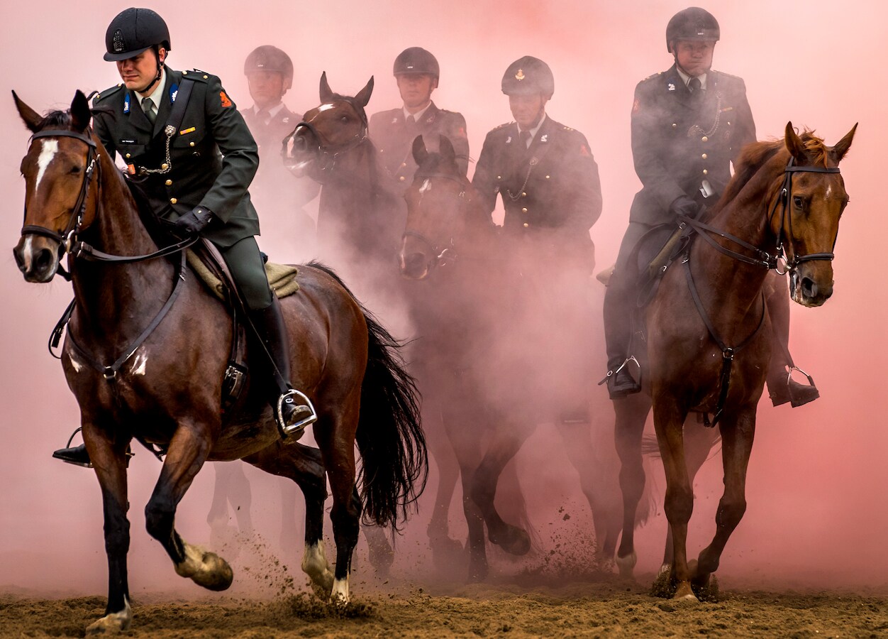 Groep militairen te paard rijdt door een wolk van rood rook tijdens een demonstratie, gehuld in uniform en helmen.
